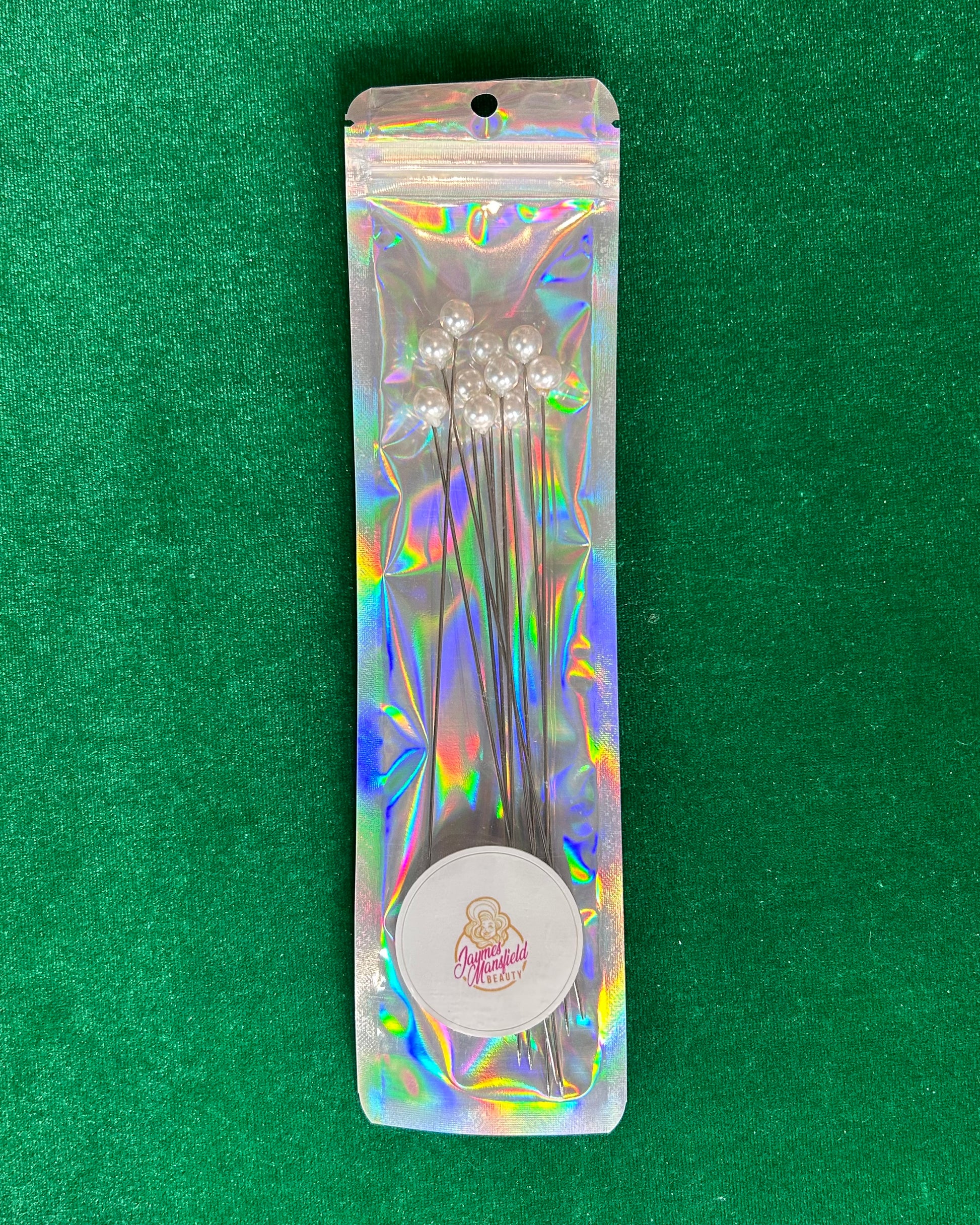 Straight hair pins for styling, and roller setting. 6 inch pins, 10 pearl head pins in a pack.