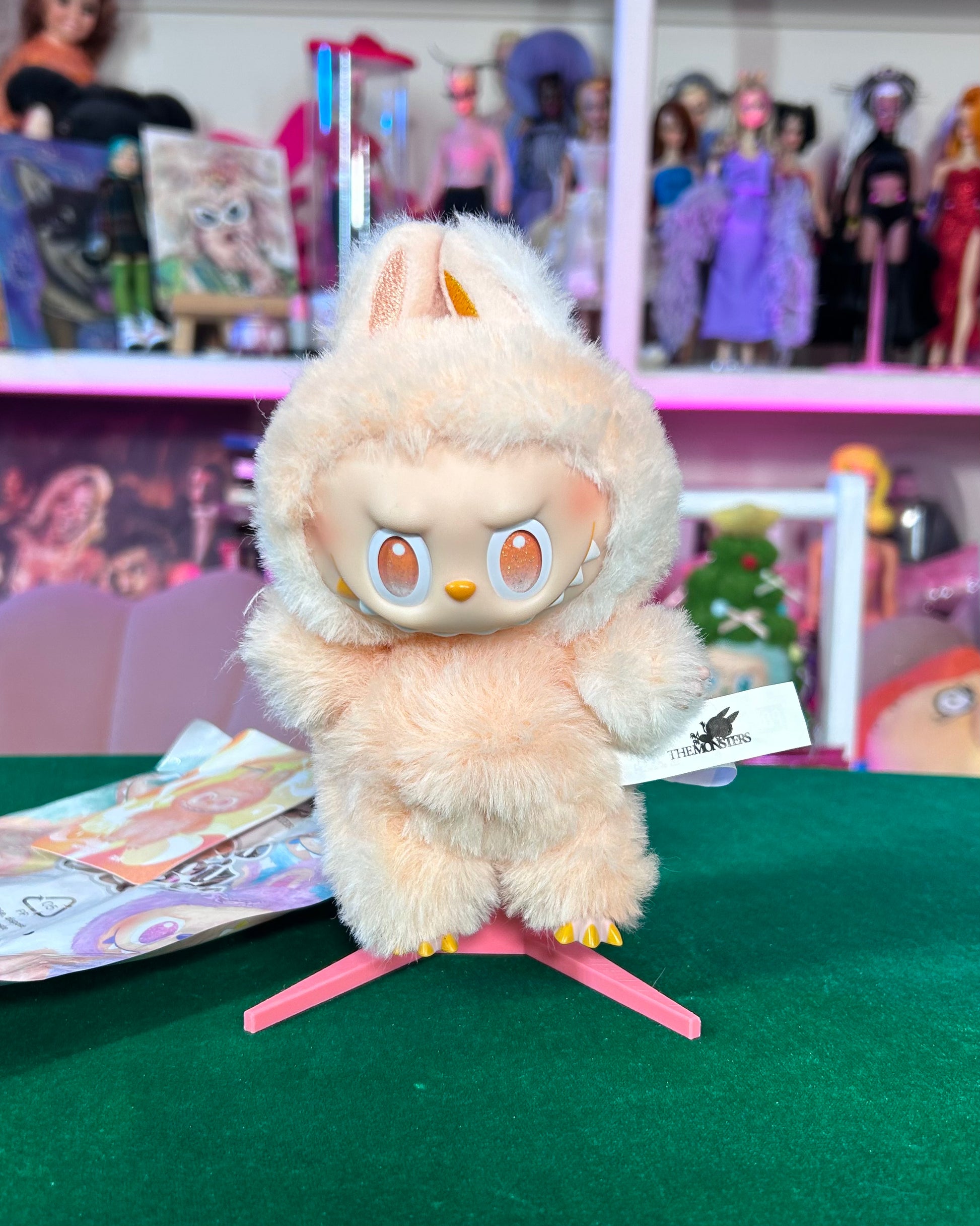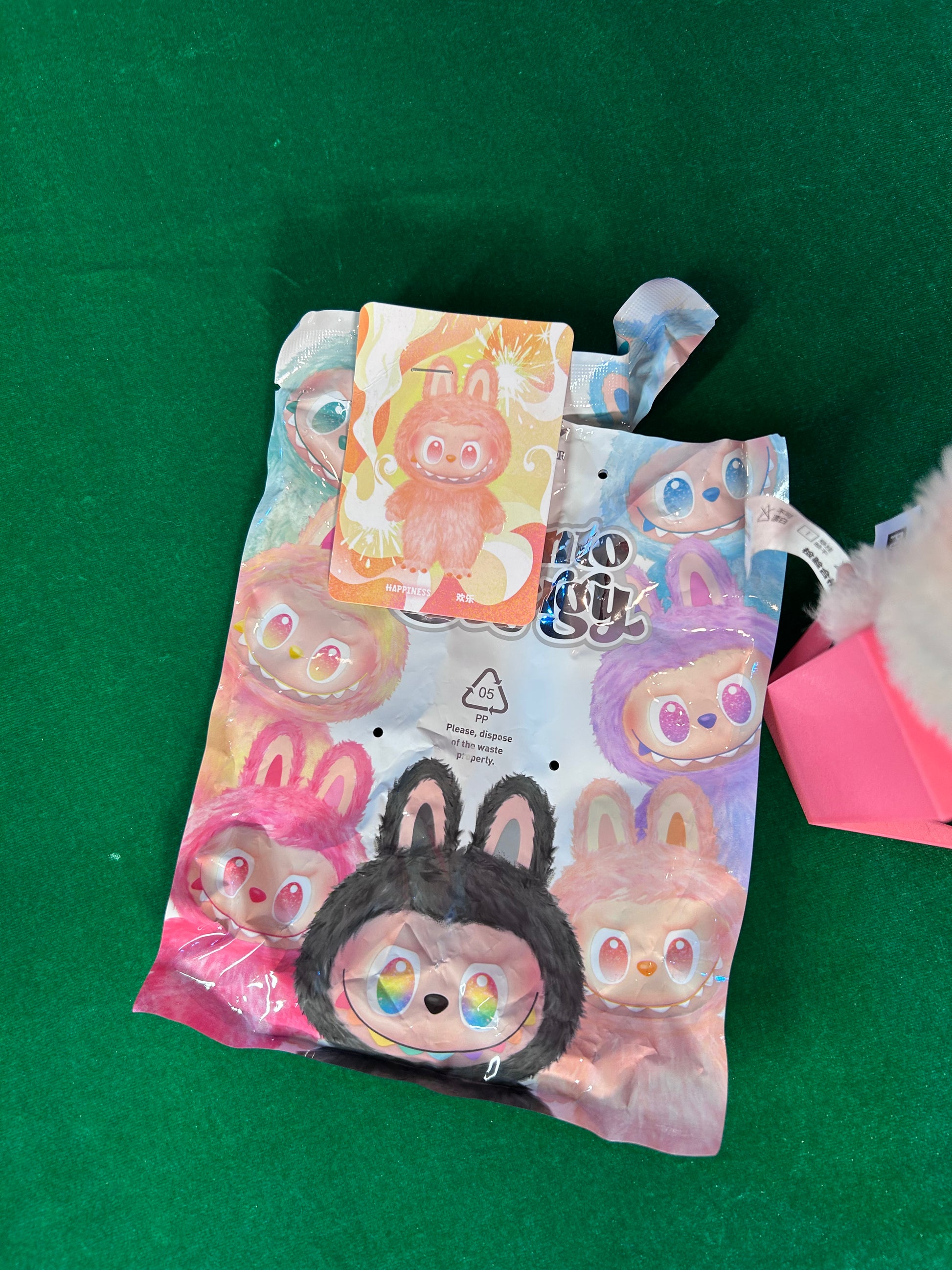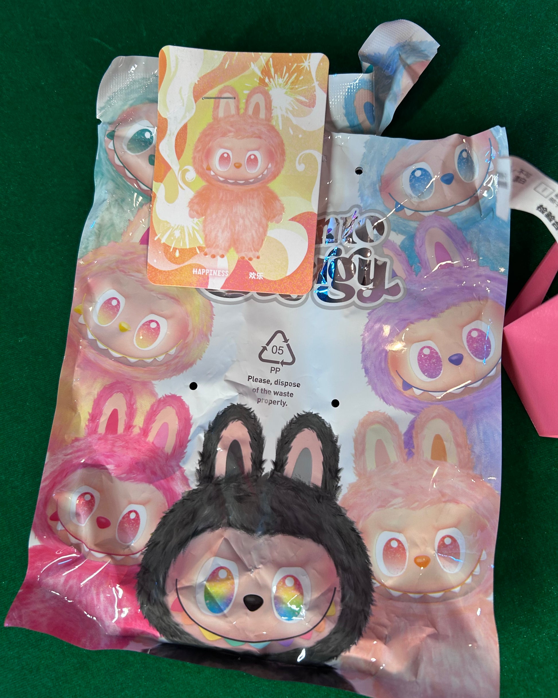 Unboxed authentic Big Into Energy Labubu. This one is HAPPINESS. No box, this is a claw machine win. HAPPINESS card is stapled to the bag.