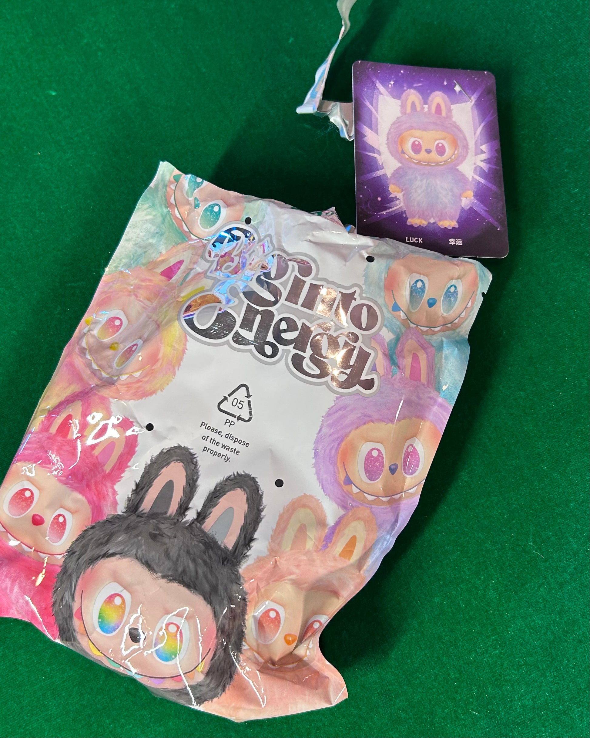Unboxed authentic Big Into Energy Labubu. This one is LUCK. No box, this is a claw machine win. LUCK card is stapled to the bag.