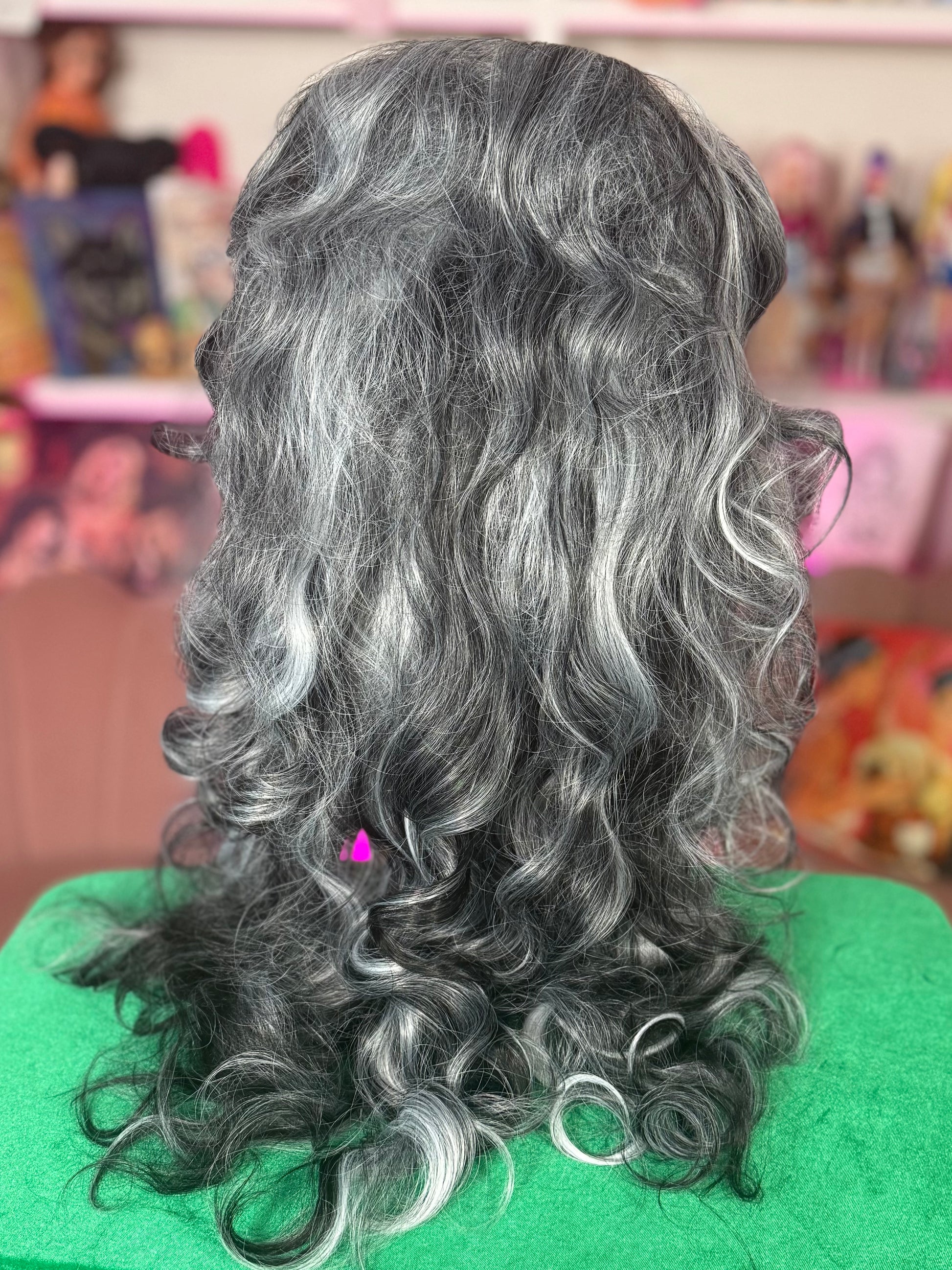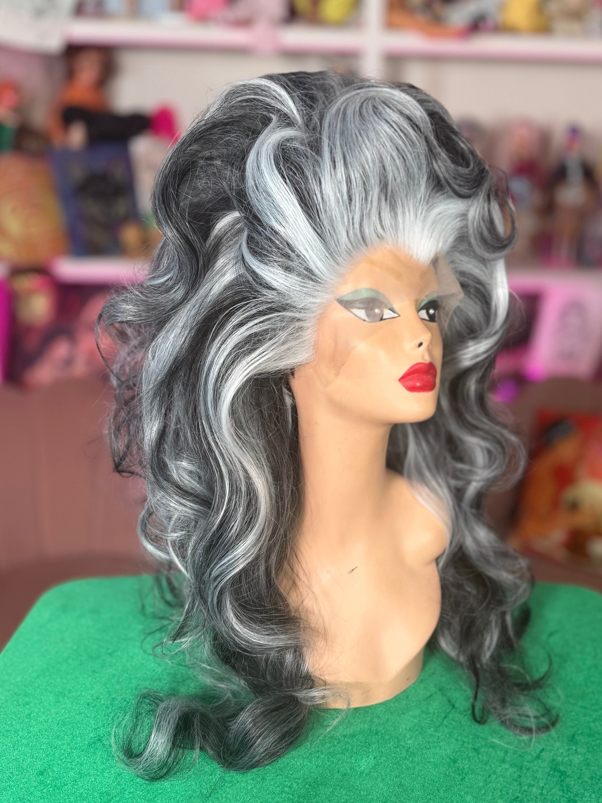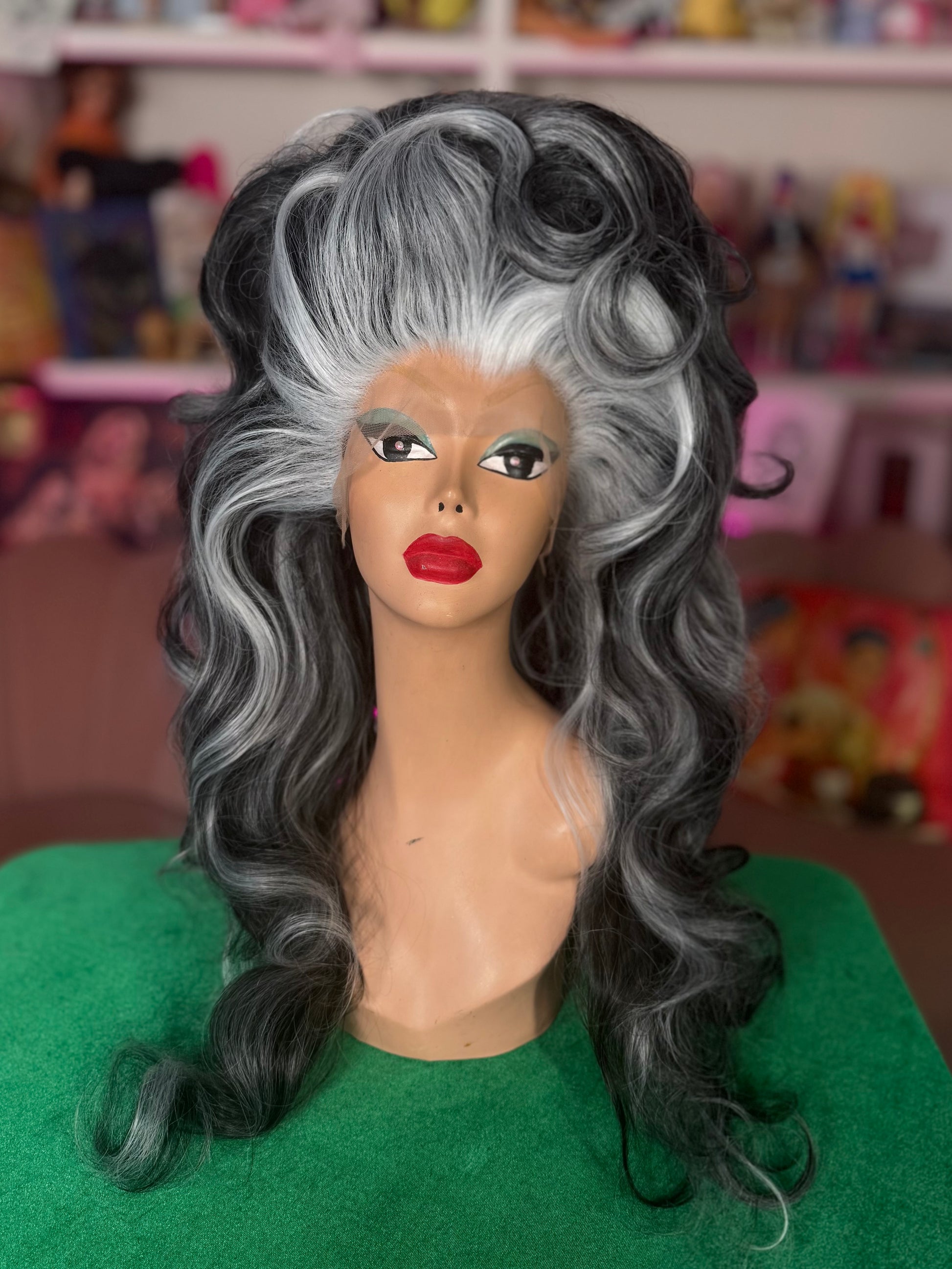 A fabulous wig inspired by ghouls of the 1960s. This wig is styled on a blended black and white wig.